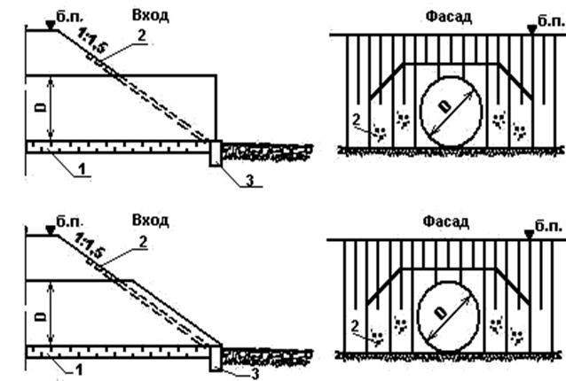 Рис.4.2. Схема конструкции трубы с верховой стороны насыпи 1 – подушка основания; 2 – укрепление откоса; 3 – противофильтрационный экран. |