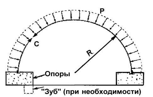 4.5.3. Гофрированная конструкция арочного типа должна быть закреплена в опорных швеллерах, которые устанавливаются на бетонной плите или фундаменте. Давление грунта на МГК приблизительно одинаково по всему периметру арки (рис. 4.4 и 4.5).