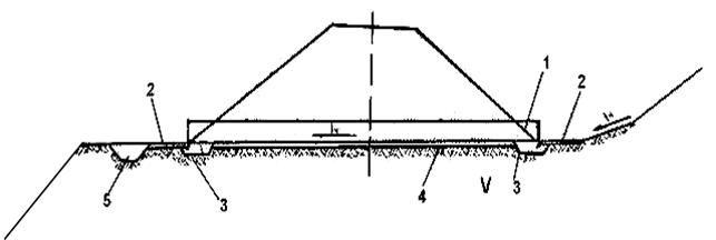 Рис. 4.8. Схема размещения МГК на косогоре 1 - входной оголовок (без скоса); 2 - укрепление русла; 3 - противофильтрационный |