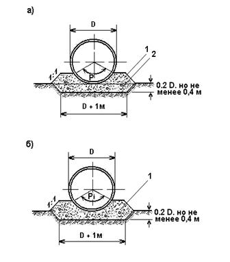 5.3.4. Если проектом предусмотрена отсыпка нулевого слоя грунта на предварительно уплотненное основание, то последнее в этом случае должно быть уплотнено на ширине не менее одного диаметра в каждую сторону от оси трубы для одноочковых и для многоочковых труб. Расстояние между многоочковыми трубами должно быть не менее 0,5D для труб диаметром до 3-х метров и не менее 1,5 метров для остальных.