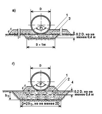 Рис.4.9. Конструкция основания а - с устройством верхней части подушки после укладки трубы; б - с предварительным устройством ложа; в - с отсыпкой нулевого слоя и устройством ложа; г - с заменой грунта. 1 - первый этап отсыпки подушки; 2 - второй этап отсыпки подушки; 3 - нулевой слой; 4 - замена грунта основания скальной отсыпкой. Р = 120° ; Pi = 90° |