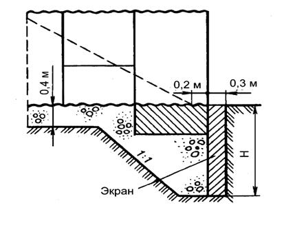 Железобетонные и бетонные экраны следует применять для МГК, сооружаемых на мелкопесчаных основаниях. Глубина заложения железобетонных и бетонных экранов должна быть не менее, чем на 0,25 м ниже расчетной глубины сезонного промерзания с учетом местных условий (рис. 4.10).