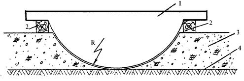 Рис.5.1. Вырезка грунтового ложа по шаблону 1 - шаблон; 2 - подкладка из брусьев; 3 - нулевой слой; 4 - верх подушки. |