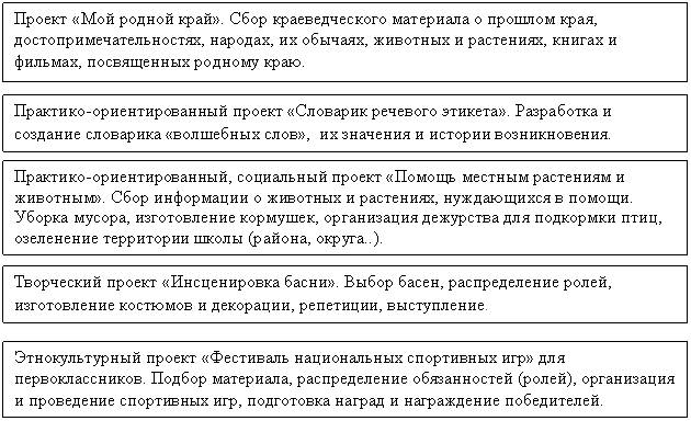 Особое значение в реализации программы духовно-нравственного содержания имеют социальные проекты. Учебники предлагают детям для выбора различные социально значимые проекты: спектакль для детей детского сада (детского дома), поздравление ветеранам, праздник для родителей и многое другое.