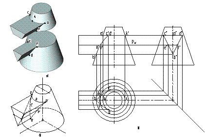 Способы определения точек линии пересечения элементарных геометрических тел изложены в данном учебном пособии.