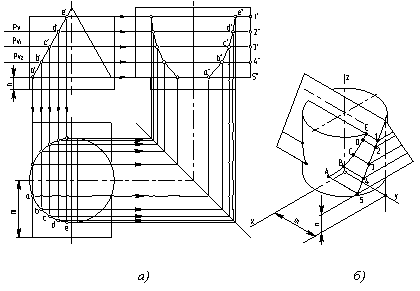 Вспомогательные секущие плоскости должны быть параллельны между собой и пересекать обе заданные поверхности по простым линиям: прямым и окружностям, причем окружности должны располагаться в плоскостях, параллельных плоскости проекций. В примере на рис. 2а плоскость Р рассекает конус по окружности, а призму – по прямым линиям.