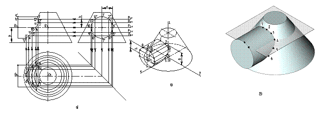 Для определения горизонтальных проекций точек пересечения из центра О1 (рис. 5а) проводят горизонтальные проекции дуг окружностей, по которым вспомогательные плоскости Р1… Р5 пересекают конус. Размеры радиусов этих дуг взяты с профильной проекции.