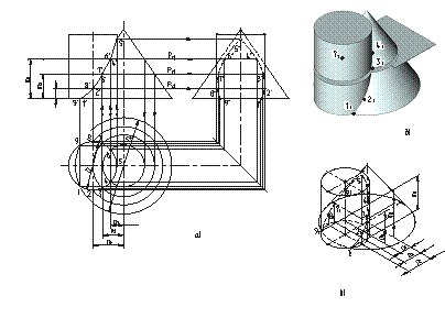 Рис. 2б показывает изометрическую проекцию, а рис. 2в – ортогональный чертеж пересекающихся тел. Построение очевидных точек А и В начинаем с фронтальной проекции, точек С и D – с профильной проекции, а промежуточные точки Е и F получаем посредством вспомогательной плоскости уровня – плоскости Р (рис. 2в).
