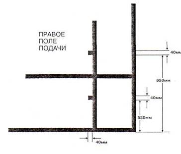9.1.2. подающий и принимающий должны стоять в пределах диагонально расположенных полей подачи (рис. 1.), не наступая на линии, ограничивающие эти поля;