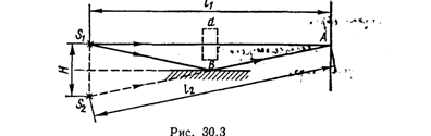 2. Стеклянная пластина толщиной d, поставленная на пути луча S1A (рис. 30.3), изменит оптическую длину пути. Теперь оптическая длина пути L будет складываться из геометрической длины пути l1—d и оптической длины пути nd луча в самой пластине, т. е.