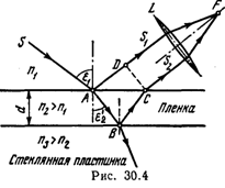 Решение. Из световой волны, падающей на пленку, выделим узкий пучок SA. Ход этого пучка в случае, когда угол падения ε1 0, показан на рис. 30.4. В точках A и В падающий пучок частично отражается и частично преломляется. Отраженные пучки света AS1 и BCS1 падают на собирающую линзу L, пересекаются в ее фокусе F и интерферируют между собой.