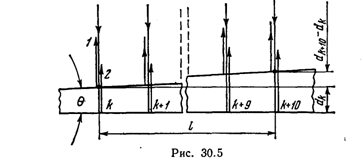 Пусть произвольной темной полосе номера k соответствует определенная толщина клина в этом месте dk а темной полосе номера k+10 соответствует толщина клина dk+10. Согласно условию задачи, 10 полос укладываются на отрезке длиной l=1 см. Тогда искомый угол (рис. 30.5) будет равен