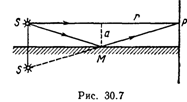 30.13. Источник S света (λ=0,6 мкм) и плоское зеркало М расположены, как показано на рис. 30.7 (зеркало Ллойда). Что будет наблюдаться в точке Р экрана, где сходятся лучи SP и SMP,— свет или темнота, если |SP|=r=2 м, a=0,55 мм, |SM|=|MP|?