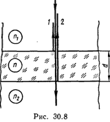 30.15. Плоскопараллельная стеклянная пластинка толщиной d=1,2 мкм и показателем преломления n=1,5 помещена между двумя средами с показателями преломления n1 и n2 (рис. 30.8). Свет с длиной волны λ=0,6 мкм падает нормально на пластинку. Определить оптическую разность хода Δ волн 1 и 2, отраженных от верхней и нижней поверхностей пластинки, и указать, усиление или ослабление интенсивности света происходит при интерференции в следующих случаях: 1) n1<.п<n2; 2) n1>n>n2; 3) п1<п>п2; 4) n1>n<n2.