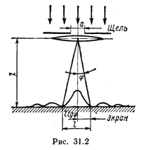 Решение. Центральный максимум интенсивности света занимает область между ближайшими от него справа и слева минимумами интенсивности. Поэтому ширину центрального максимума интенсивности примем равной расстоянию между этими двумя минимумами интенсивности (рис. 31.2).