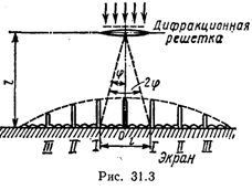 Пример 3. На дифракционную решетку нормально к ее поверхности падает параллельный пучок света с длиной волны λ=0,5мкм. Помещенная вблизи решетки линза проецирует дифракционную картину на плоский экран, удаленный от линзы на L=l м. Расстояние l между двумя максимумами интенсивности первого порядка, наблюдаемыми на экране, равно 20,2 см (рис. 31.3). Определить: 1) постоянную d дифракционной решетки; 2) число n штрихов на 1 см; 3) число максимумов, которое при этом дает дифракционная решетка; 4) максимальный угол φmах отклонения лучей, соответствующих последнему дифракционному максимуму.