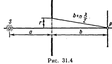 31.8. Точечный источник S света (λ=0,5 мкм), плоская диафрагма с круглым отверстием радиусом r=1 мм и экран расположены, как это указано на рис. 31.4 (а=1 м). Определить расстояние b от экрана до диафрагмы, при котором отверстие открывало бы для точки Р три зоны Френеля.