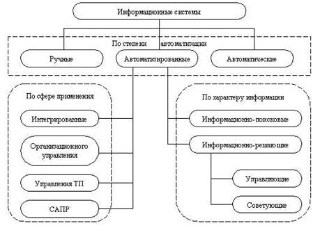 В зависимости от степени автоматизации информационных процессов в системе управления предприятием информационные системы определяются как ручные, автоматические, автоматизированные.