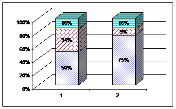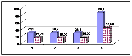 1 - в начале эксперимента; 2 - в конце эксперимента