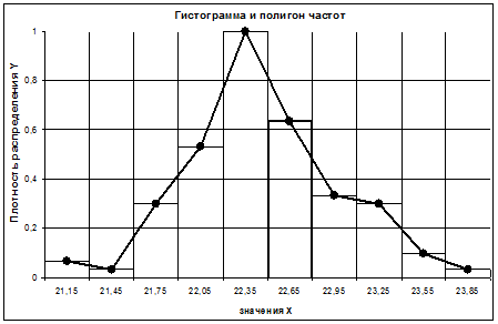 Рис. 1.4.1 Пример построения гистограммы и полигона частот.