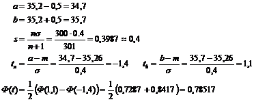 Получили Ф(t)=0,785 что соответствует 78,5% от всей партии или 235,5~236 шт., а бракованных – 21,5% или 64 шт.