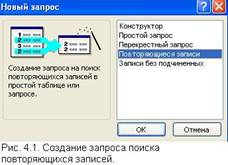 1. Выберите объект базы - Запросы. Нажмите кнопку Создать, в открывшемся окне Новый запрос выберите вид запроса - «Повторяющиеся записи» (рис. 4.1).