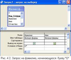 5. В строке «Условие отбора» поля Фамилия наберите условие - О* (* заменяет любую группу символов, ? заменяет один символ, # заменяет одну цифру ). (рис. 4.2).