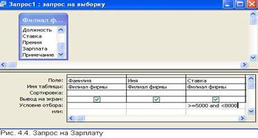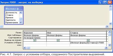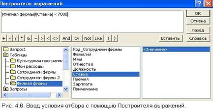 3. В окне Построитель выражений выберите таблицу «Филиал фирмы» и, используя поле Ставка, наберите соответствующее условие, пользуясь инструментами Построителя выражений рис.4.6..