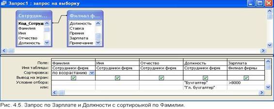 4. Задайте сортировку по фамилиям. Созданный запрос имеет вид, как на рис. 4.7.