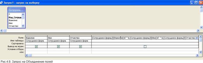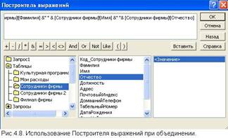1. Для объединения текстовых полей используется Построитель выражений (рис.4.9).Выражение для нового поля, объединяющего текстовые значения других полей в строке «Поле» бланка запроса должно иметь следующий вид: