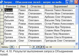Задание 4.10. Объединение текстовых полей. Создать запрос на выборку, в котором представлено поле, содержащее объединение текстовых значений полей Фамилuя, Имя и Отчество, разделенных пробелами.