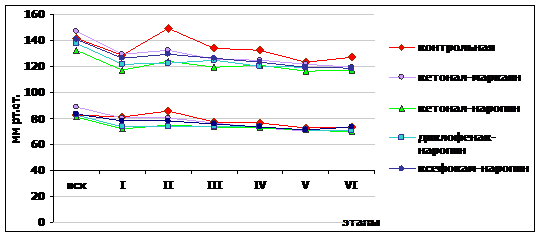 Статистический анализ показал, что в группах «диклофенак-наропин», «кетонал-наропин» и «кетонал-маркаин» гемодинамические показатели были стабильными на всех этапах исследования, как периферические, так и центральные. Статистически значимое снижение УО, СИ, МОС и ОПСС на I этапе во всех группах больных связано с симпатическим блоком, что высоко коррелирует с параметрами периферической гемодинамики (АДс, АДд, Адср., ЧСС). В подгруппе «ксефокам-наропин» изменения периферической гемодинамики отличались от остальных подгрупп основной группы, так как на II этапе исследования имелось статистически значимое повышение АДс, АДд, ЧСС, АДср, что связано с недостаточным уровнем анальгезии на фоне планового введения ксефокама при данных операциях. Однако средние значения показателей периферической гемодинамики были нормальными, а их колебания составили 15-20%, что в пределах физиологической нормы (рис. 1).