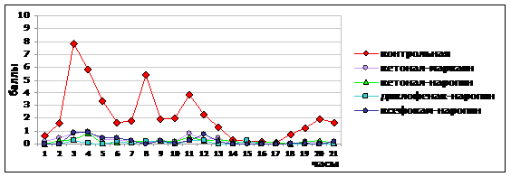 Признак | Контроль | «Диклофенак-наропин» | «Ксефокам-наропин» | «Кетонал-наропин» | «Кетонал-маркаин» |