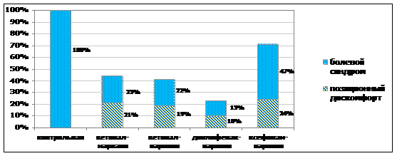В значительном проценте случаев пациентам основной группы (от 29% в группе «ксефокам-наропин» до 77% в группе «диклофенак-наропин») не требовалось введения наркотического анальгетика. Остальным больным промедол вводился в связи с развитием позиционного дискомфорта или умеренного болевого синдрома (рис. 3).