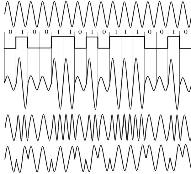 Для передачи логических нулей и единиц используются синусоиды различных частот (рис. 1,в).