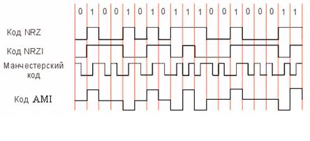 Для того чтобы приемник считывал информацию с линии связи в строго определенные моменты времени необходимо обеспечить синхронизацию передатчика и приемника. Эта задача может быть решена несколькими методами: методом синхронной передачи, методом асинхронной передачи, методом передачи с автоподстройкой. Последний метод применяется в современных высокоскоростных системах передачи данных. Синхронизация в соответствии с этим методом достигается за счет использования самосинхронизирующихся кодов, в которых указанием для синхронизации передатчика с приемником служат резкие перепады сигнала, т. е. фронты импульсов. Чем чаще перепады сигнала, тем надежнее синхронизация, а, следовательно, достовернее идентификация принимаемых битов данных. Имеется целый ряд самосинхронизирующихся кодов: NRZ, AMI, NRZI, манчестерский и др.