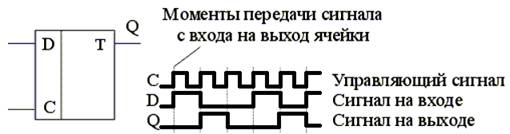 В момент изменения тактирующего импульса из состояния 0 в состояние 1 на выход ячейки передается тот сигнал, который был на его входе в предыдущий момент времени, то есть когда управляющий сигнал С был равен 0. После этого состояние выхода не изменяется (ячейка заперта) вплоть до прихода следующего положительного фронта тактирующего импульса.