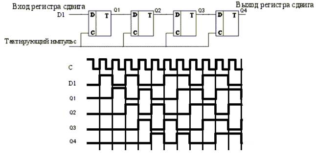 Используя цепочку, состоящую из нескольких последовательно связанных запоминающих ячеек с одним и тем же управляющим сигналом, можно составить регистр сдвига (Рис.4), в котором информационные биты будут последовательно передаваться от одной ячейки к другой синхронно по положительному фронту тактирующего импульса.