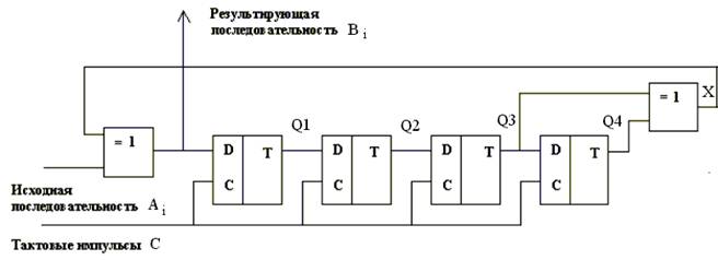 На рис.5 приведен пример скремблера, на вход которого подается исходная последовательность подвергаемая скремблированию