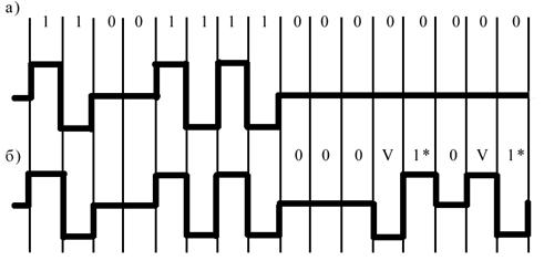 гдеV- сигнал единицы, запрещенной для данного такта полярности, 1*- сигнал единицы корректной полярности, * обозначает, что в исходном коде в этом такте была не 1, а 0.