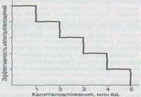Как видно из графика, эффективность (прибыльность) каждого последующего вложения снижается. Практический смысл графика в том, что на предприятии с его помощью могут найти (опытно определить) предельный размер инвестирования. Как видно из графика, оптимальный объем инвестирования – 5 млн. ед. Вложения 6 млн. ед. уже будут невыгодны. Таким образом, мы решаем своего рода оптимизационную задачу, наметив в определенной мере стратегию инвестирования. Крутизна графика предельной эффективности инвестирования зависит, по меньшей мере, от двух главных факторов: