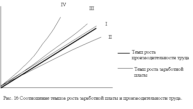 Если темп роста заработной платы опережает темп роста производительности труда, то такая модель стимулирует рост производительности труда, но порождает инфляцию (рис. ,III). Слишком высокие темпы роста заработной платы (рис. , IV) нарушают связь между затратами труда и его оплатой, что так же приводит к снижению его производительности.