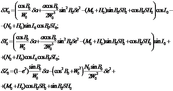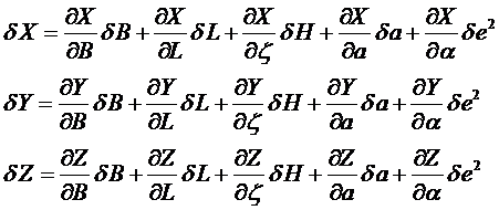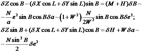 Это может быть выражено дифференциальными уравнениями, в которых дифференциалы параметров эллипсоида и геодезических координат заменены их конечными и малыми приращениями: