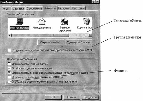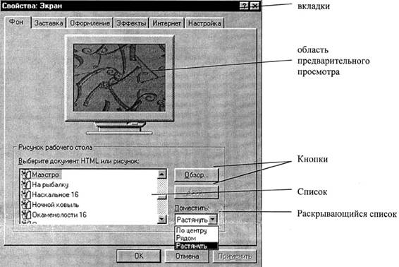 Область предварительного просмотра. При проведении сложных многосторонних настроек иногда трудно оценить, что же получится в итоге. В таких случаях диалоговые окна могут содержать область предварительного просмотра, в которой в уменьшенном и упрощенном виде отображаются результаты настройки. В некоторых случаях эту область можно использовать для отбора настраиваемых параметров.