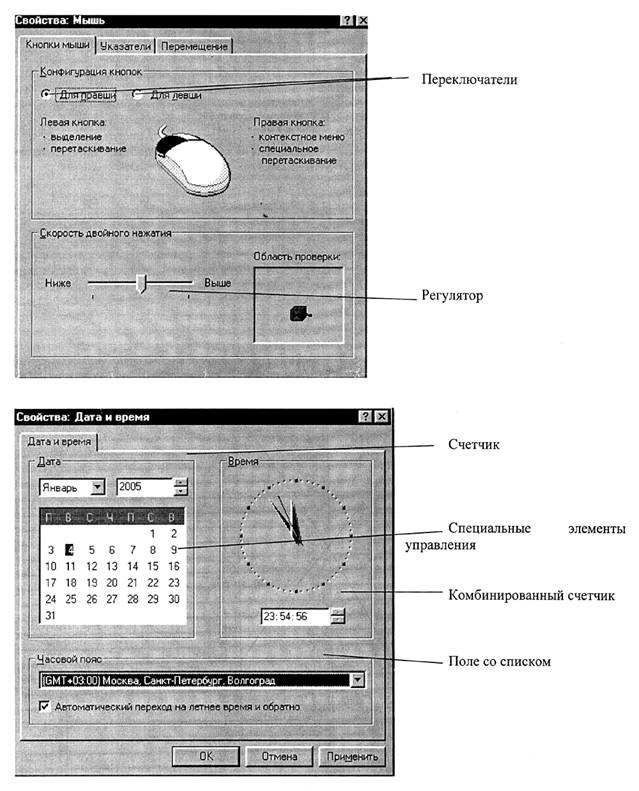 Специальные элементы управления. В некоторых диалоговых окнах могут использоваться специальные элементы управления, не вписывающиеся в приведенную классификацию. Так как диалоговые окна служат для настройки самых разнообразных параметров, некоторые из этих параметров удобнее задавать особым образом. В таких случаях в программах появляются специальные элементы управления, подходящие для конкретной ситуации. Например, календарь для выбора текущего числа относится к нестандартным элементам управления. Такое представление намного нагляднее, чем использование счетчика или раскрывающегося списка.