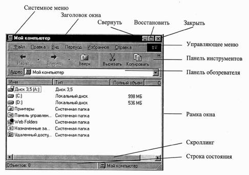 Одним из основных понятий пользовательского интерфейса Windows NT является окно, как ограниченная прямоугольной рамкой часть поверхности экрйна, имеющая ряд общих элементов. В окне Windows NT отображаются папки и файлы, выполняемые программы и документы.