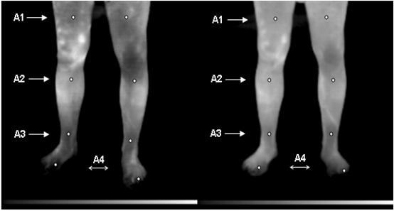 Значения температуры в контрольных точках нижних конечностей до и после внутривенного введения 200 мл перфторана и термограмма представлены в табл. 10 и на рис.21. После введения перфторана максимальные изменения регистрировались на стороне наибольшей выраженности патологического процесса – стопы левой ноги, что свидетельствует о выраженном улучшении кровообращения системе микроциркуляции под влиянием перфторана.