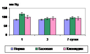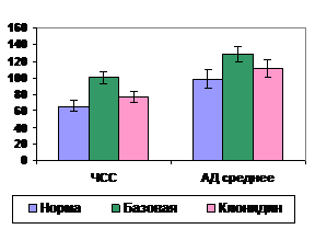1. Влияние клонидина на центральную гемодинамику. По сравнению базовой терапией при использовании клонидина зарегистрировано улучшение функциональных резервов сердечно-сосудистой системы на фоне резкого снижения потребности в О2. С 1 суток отмечено уменьшение ЧСС и гипертензии. УПС было ниже, чем при базовой терапии в 1,4 раза (р<0,02) (рис. 23,24).