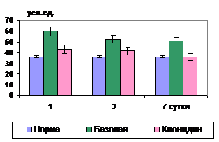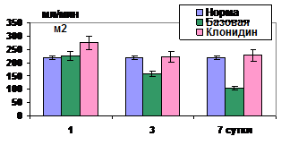 3. Влияние на структуру мембран эритроцитов. По сравнению с базовой терапией при использовании клонидина отмечена нормализация структуры мембран эритроцитов в результате выраженного снижения активности ПОЛ (в 1,7-3,2 раза). Активность каталазы к 7 суткам превышала таковую в 1,8, СОД – в 2,4, а концентрация токоферола – почти в 3 раза (рис.31,32).