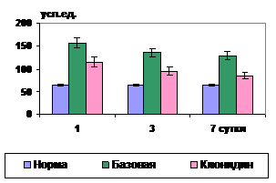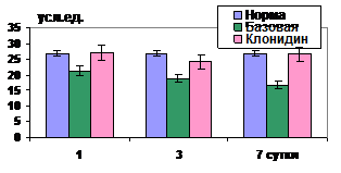 ПС, НЛИ и потребность в О2 уже в 1 сутки были почти в 1,5 раза ниже (р<0,01), а индекс Кердо нормализовался к 3 суткам, что свидетельствует о выраженном симпатолитическом эффекте клонидина (рис.25,26). Работа и мощность желудочков сердца в течение всего срока исследования в среднем на 20% превышали норму.